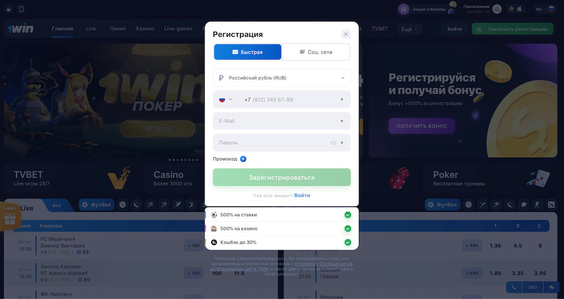 Для регистрации на официальном игровом портале 1Вин нужно зайти на зеркало букмекера. Зеркало - это тот же ресурс БК, который помогает беттерам обходить блокировку основного сайта. Для того чтобы полностью зарегистрироваться новому игроку потребуется указать свои настоящие данные, страну проживания и выбрать игровую валюту. ФИО и адрес проживания требуется вписывать реальные, при несовпадении данных (БК проводится тщательная проверка) аккаунт пользователя будет заблокирован. Снятие выигрыша происходит через ту систему, через которую был совершен ввод денег.